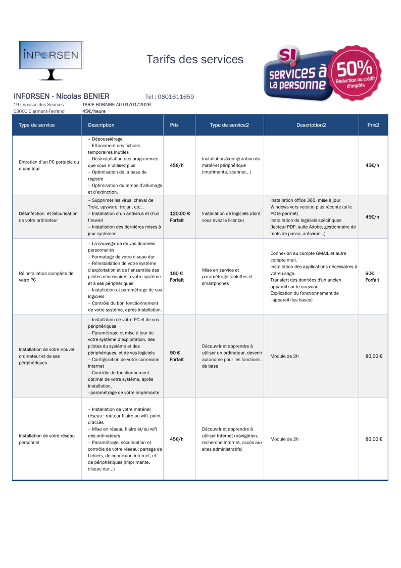 Grille des tarifs 2026